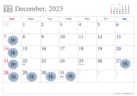 冬季休業のお知らせ 2025.12.17 誠に勝手ではございますが、 2025年12月27日(土)より2026年1月4日(日)までの間 冬季休業とさせていただきます。 上記期間中にいただきましたメールへのご返答は、 1月5日(月)以降に、順次行ってまいります。ご返答までにお時間をいただく場合がございますので、予めご了承ください。 お客様にはご不便をお掛けいたしますが、何卒ご理解いただきますようお願い申し上げます。 前の記事 一覧 次の記事