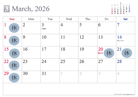 2026年3月休業日のお知らせ